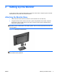 2. To attach the monitor to a swing arm, insert four 10mm screws through the holes on the swing arm plate and into the mounting holes on the monitor. Figure 2-9 Mounting the Monitor To attach the monitor to other mounting fixtures, follow the instructions included with the mounting fixture to ensure that the monitor is safely attached. 3. Reconnect the cables to the monitor panel. Installing a Cable Lock You can secure the monitor to a fixed object with an optional cable lock available from HP.