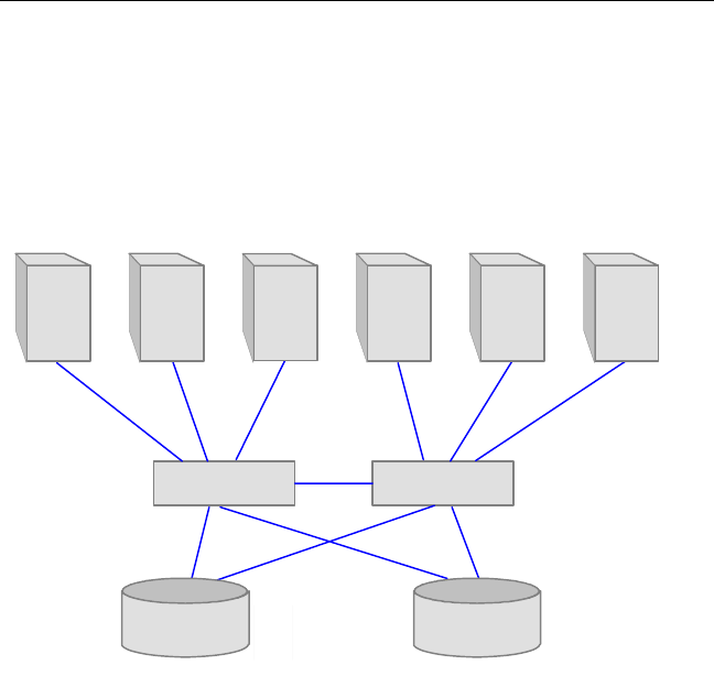 1–3 are connected to the first FC switch; servers 4–6 are connected to the
