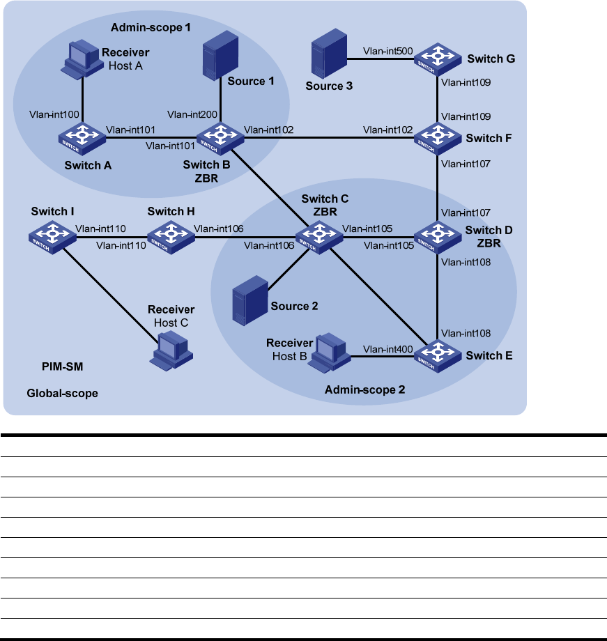 VLAN-interface 101 of Switch B acts as a C-BSR and a C-RP for admin-scoped zone 1, and