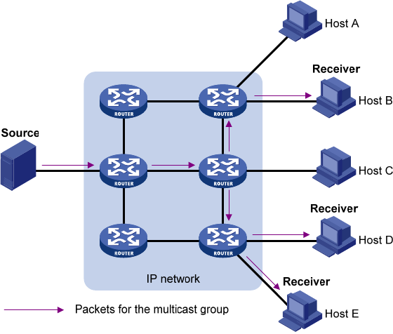 The multicast source sends only one copy of the information to a multicast group. Host B, Host D, and