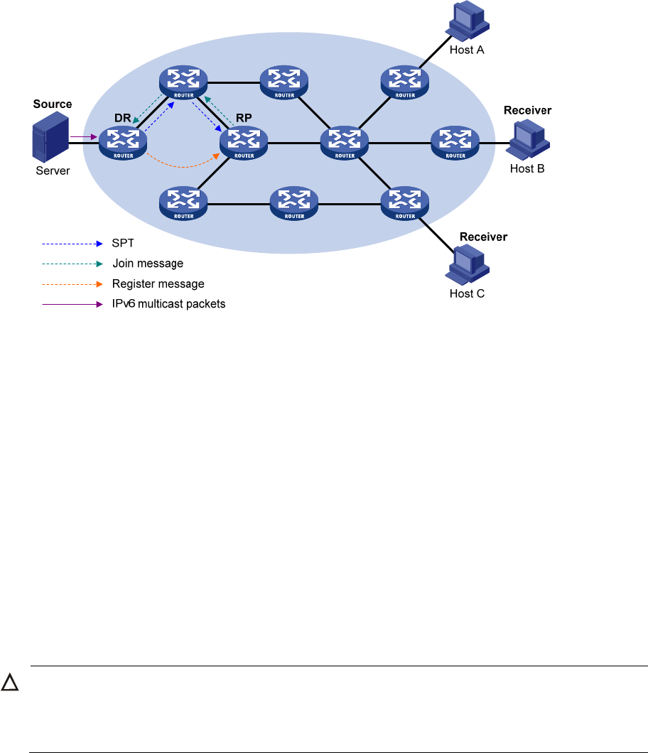 source. The routers along the path from the RP to the IPv6 multicast source constitute an SPT branch,