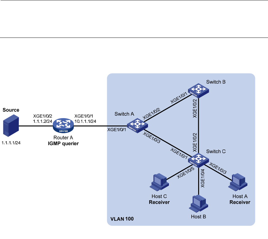 As shown in Figure 13, Router A runs IGMPv2 and serves as the IGMP querier, and Switch A, Switch B,