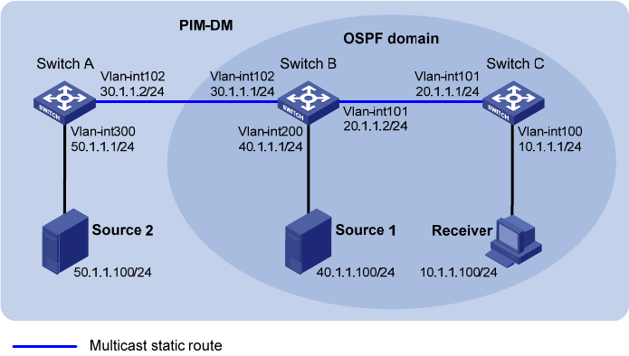 2. Enable OSPF on Switch B and Switch C to make sure the network-layer on the PIM-DM network is