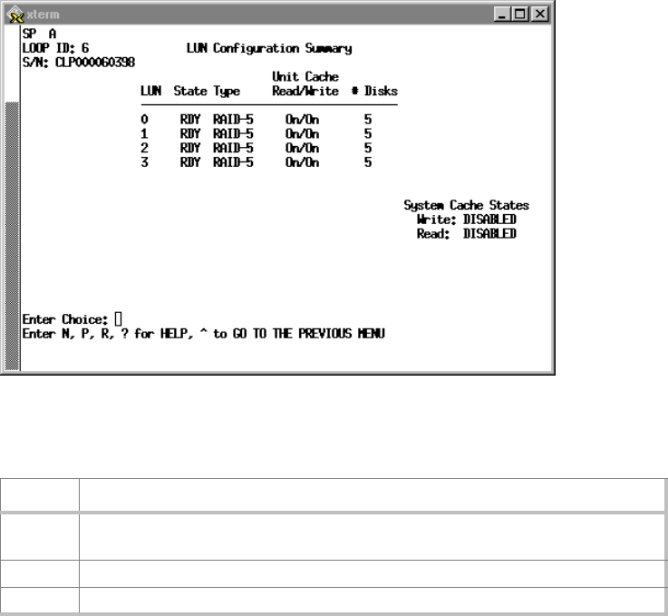 N or n Moves to the next screen (there are additional screens if there are more LUNs