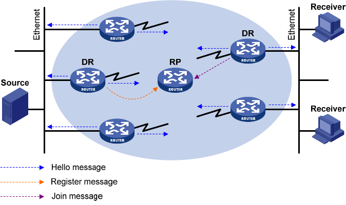 PIM-SM also uses hello messages to elect a DR for a shared-media network (such as Ethernet). The