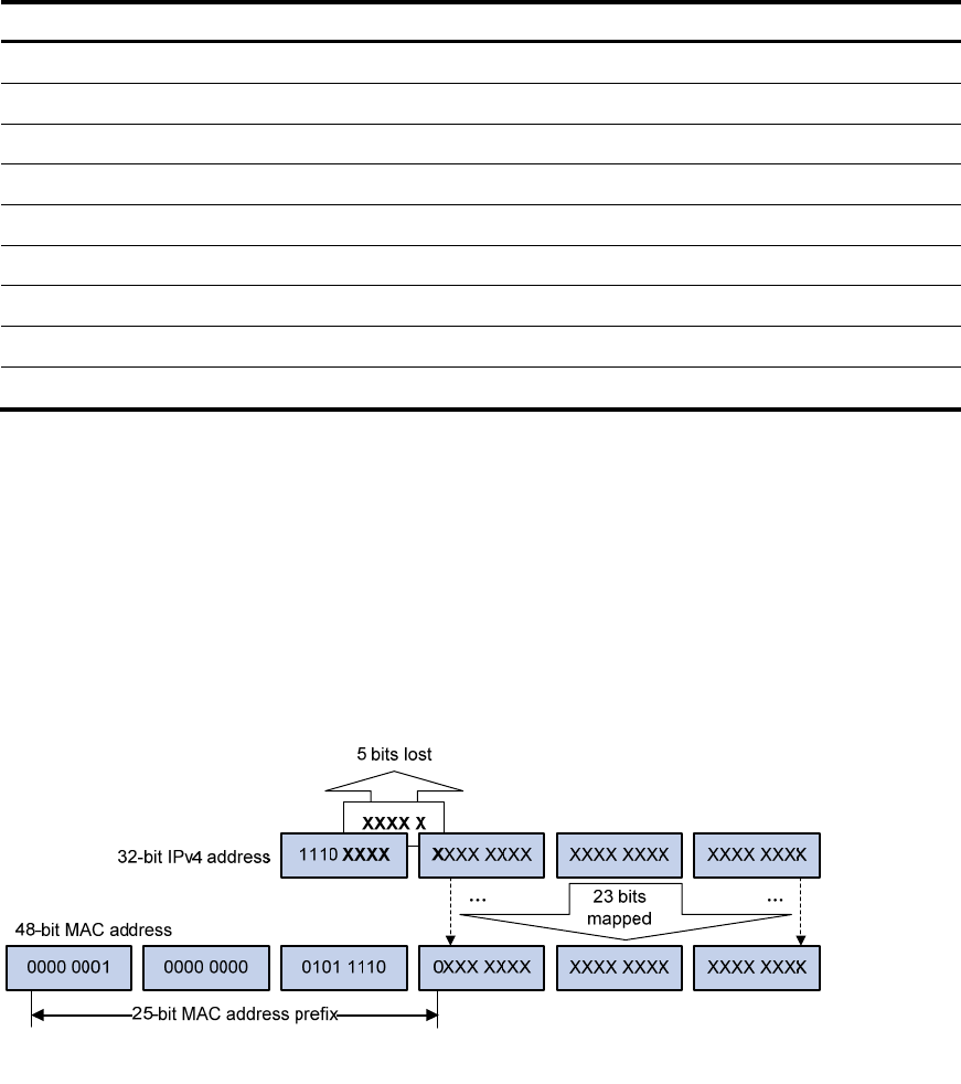 mapped to a MAC address, so five bits of the multicast IPv4 address are lost. As a result, 32
