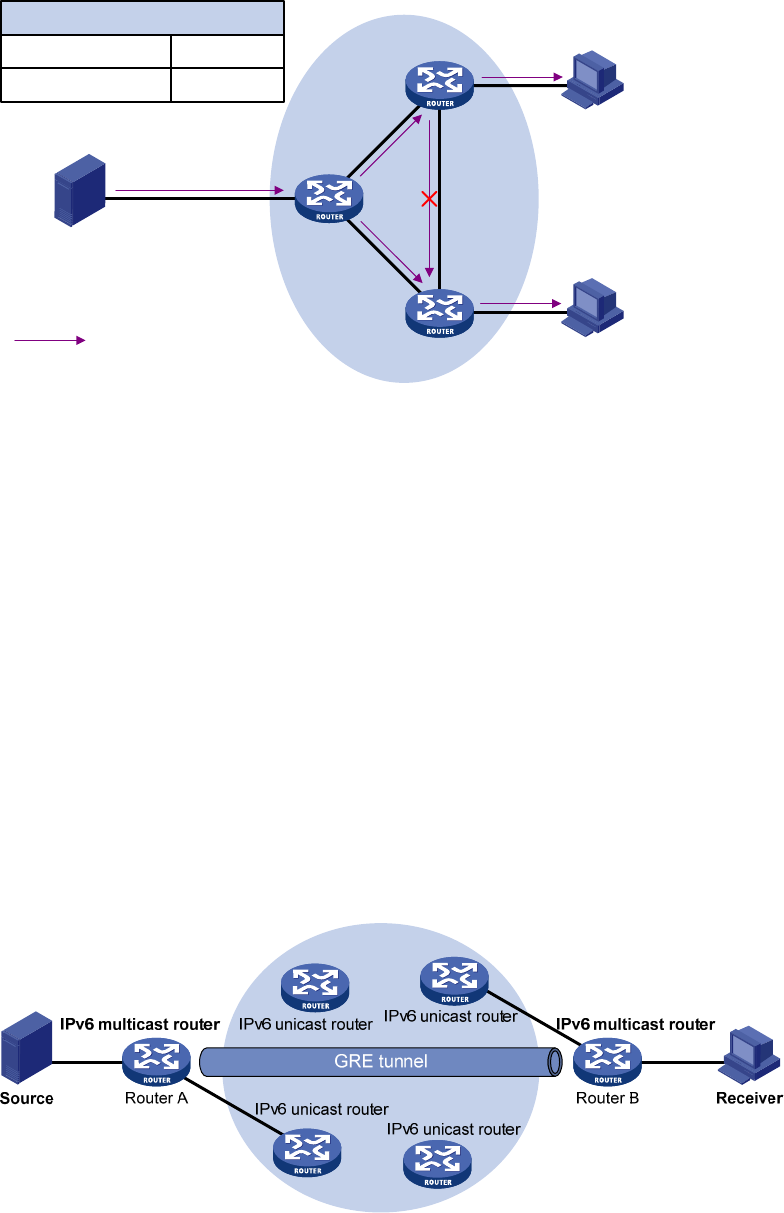 Figure 77 IPv6 multicast data transmission through a tunnel