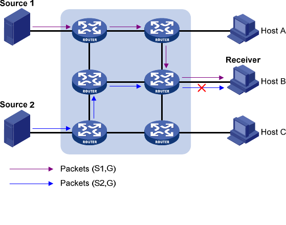 Figure 80 Flow paths of multicast-address-and-source-specific multicast traffic