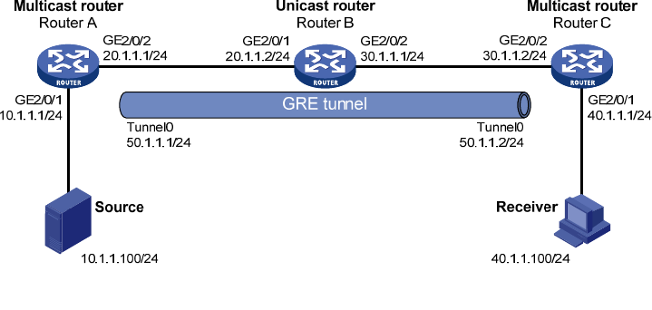 OSPF is running on Router A, Router B, and Router C. Configure a GRE tunnel so that Receiver can
