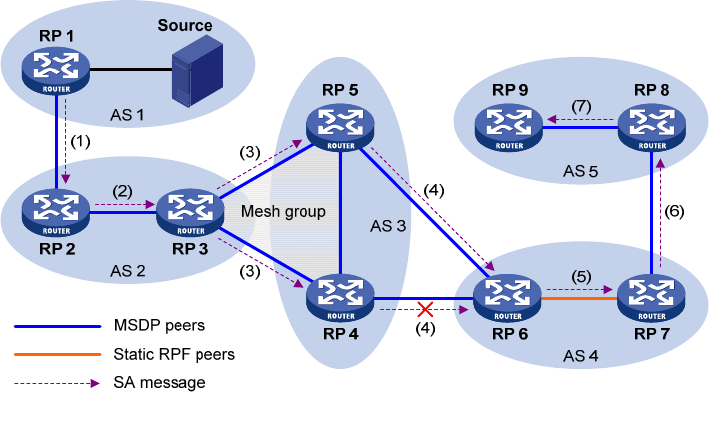 peering relationships have been established among different RPs. RP 3, RP 4, and RP 5 are in an MSDP
