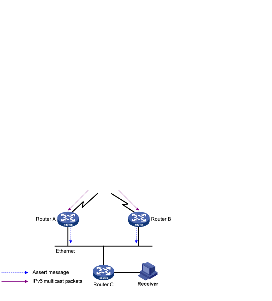 2. After detecting this condition, both routers send an assert message to all IPv6 PIM routers on the