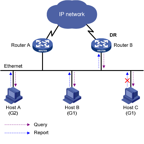 the same subnet as Host B) suppresses its own report for G1, because the IGMP routers (Router A