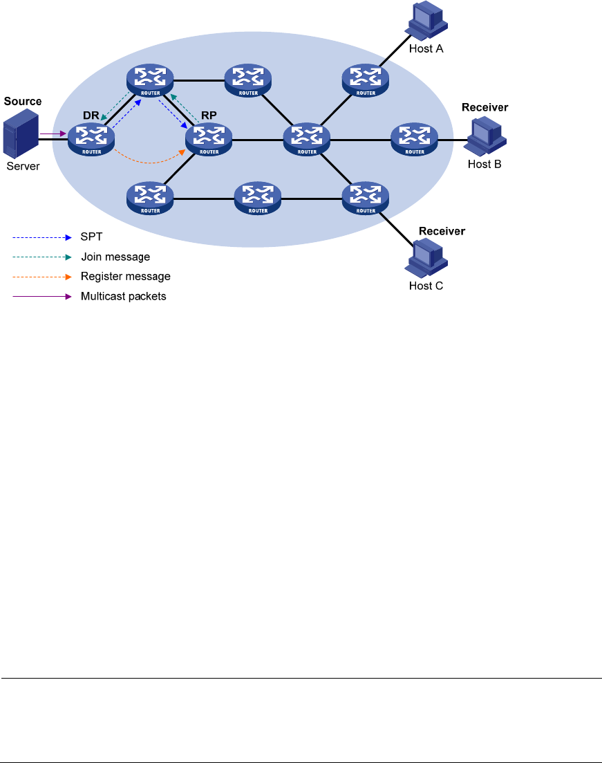 4. The subsequent multicast data from the multicast source travels along the established SPT to the RP.