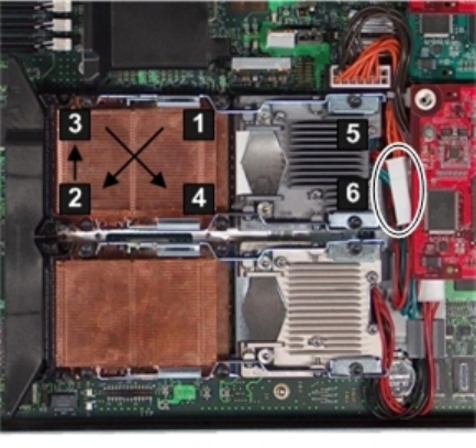 7. Tighten the captive screws (5 – 6) on the processor with the Torx T-15 screwdriver until snug