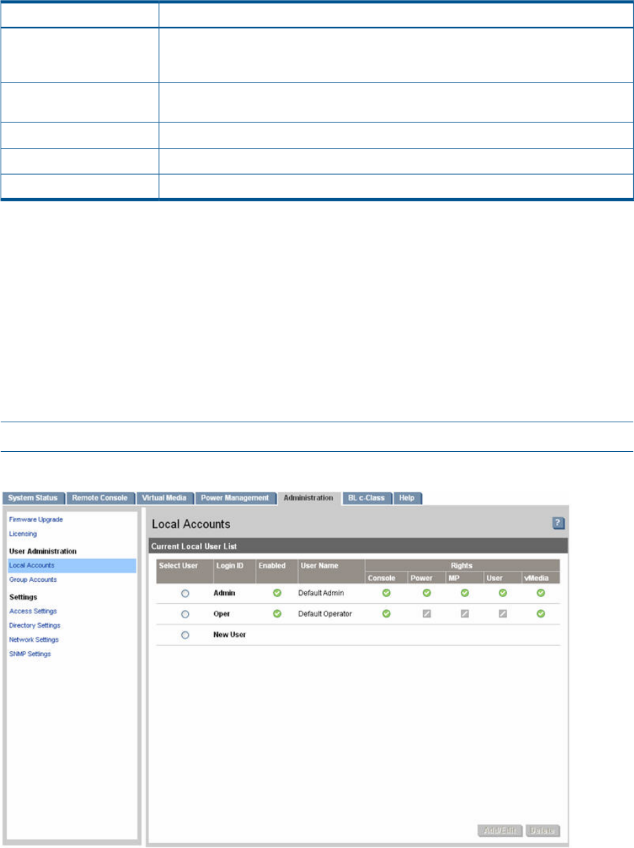 The Local Accounts page (Figure 35) displays the current list of users, their privilege rights and
