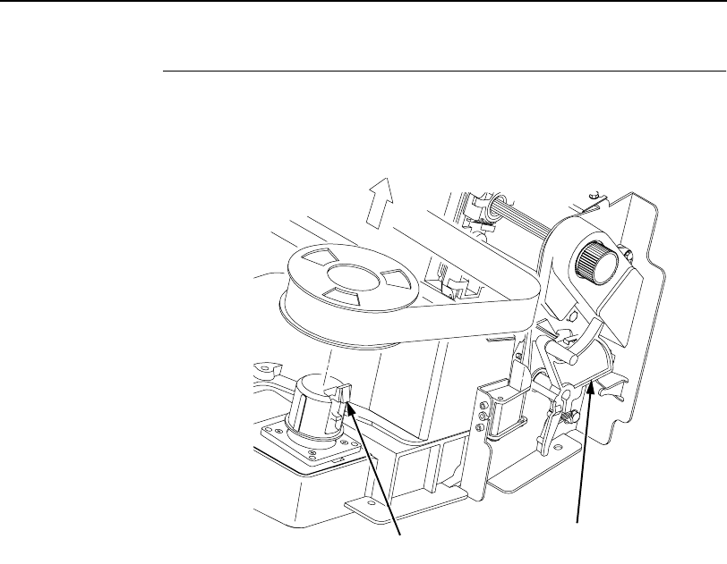 b. Press in on the hub latches (2) and lift the ribbon spools off the
