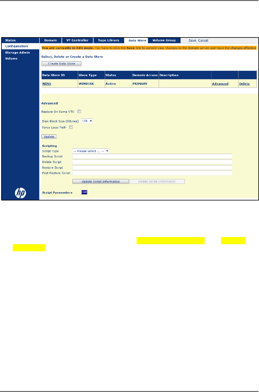 The initial Advanced page of the Data Store configuration is as below
