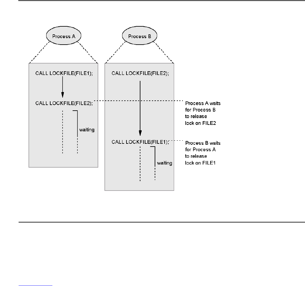 Process B can never release the lock it has on file 2 because it is waiting for a lock on