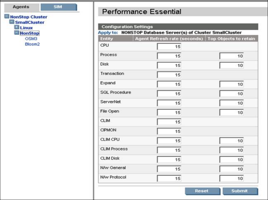 configurable parameters for each entity: Agent refresh rate and Top objects to retain.