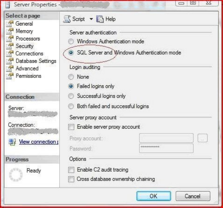 1. In the Server Properties dialog box, confirm that “SQL Server and Windows