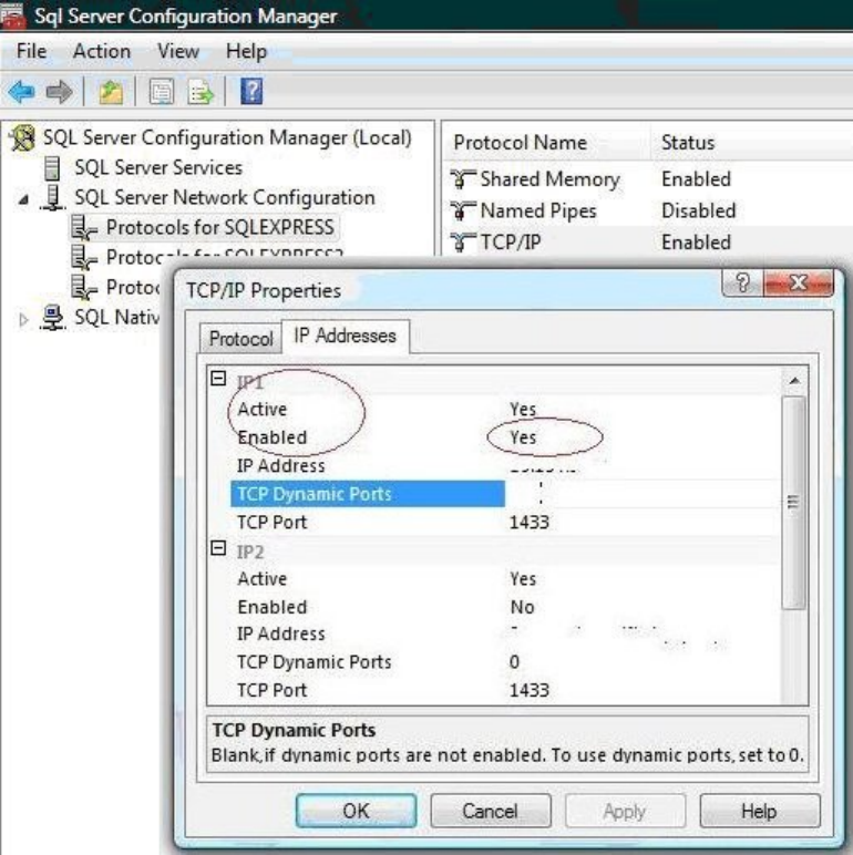 of the HP SIM’s SQL Server Database instance should be Active and Enabled for IP