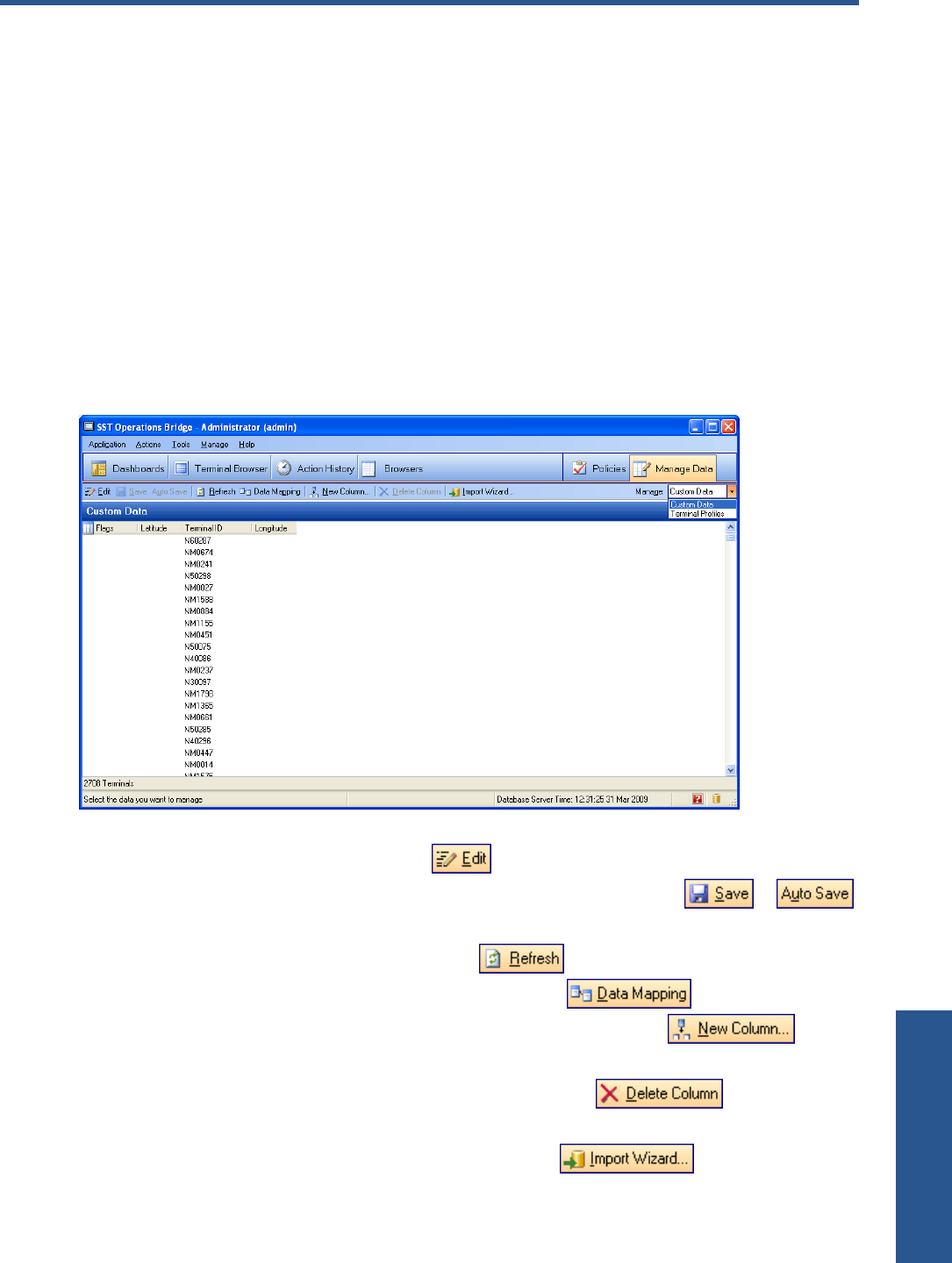 The Manage Data tab in the SST/OB Client Application enables you to manage the Custom Data and Terminal