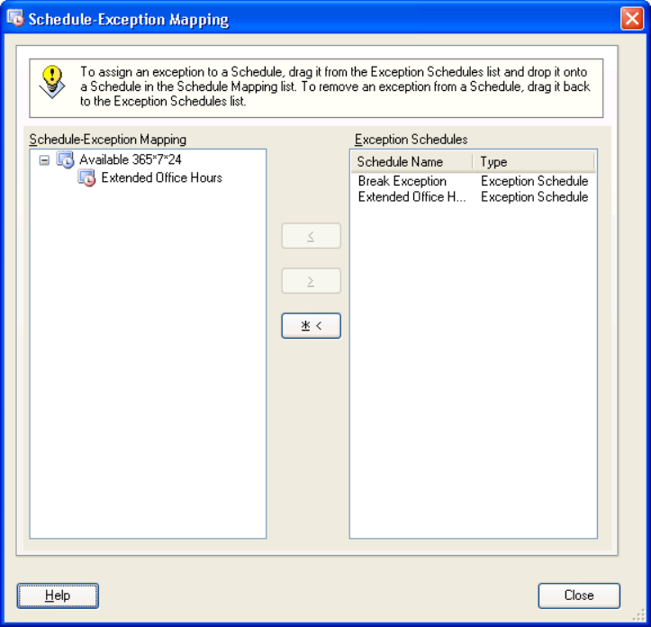 and drop it onto a schedule in the Schedule-Exception Mapping list. To remove an exception from a