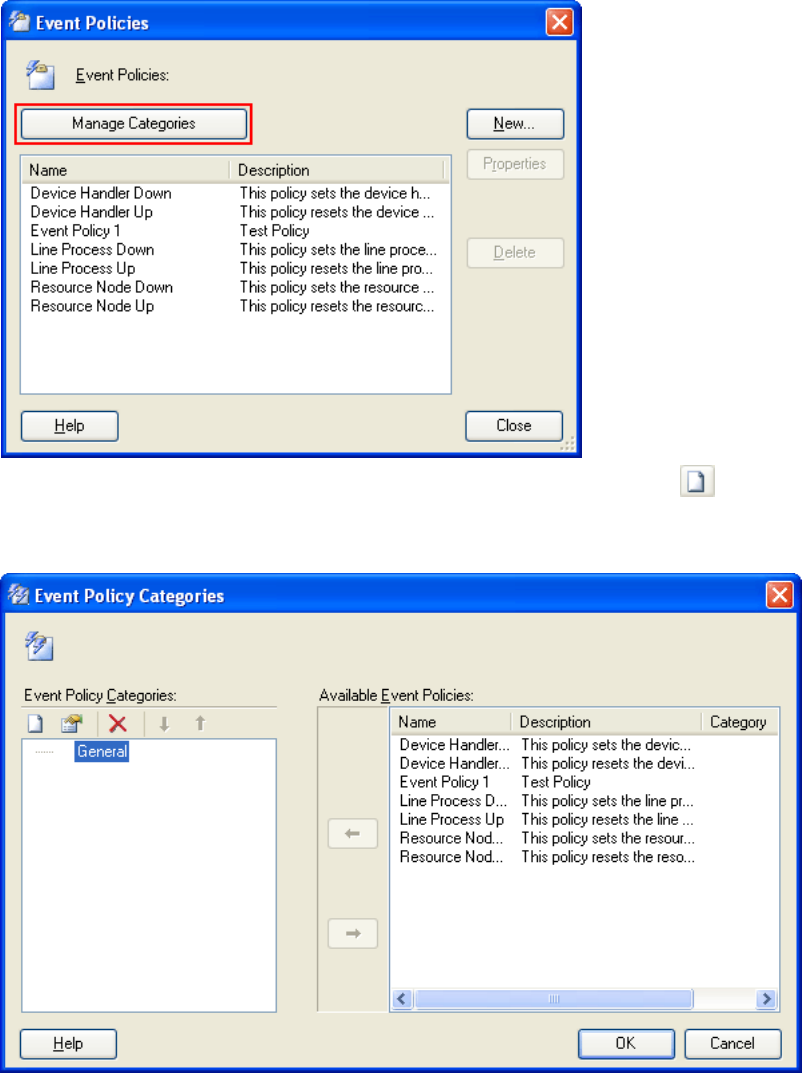 The Manage Categories button on the Event Policies dialog box can be used to create Event Policy Categories.