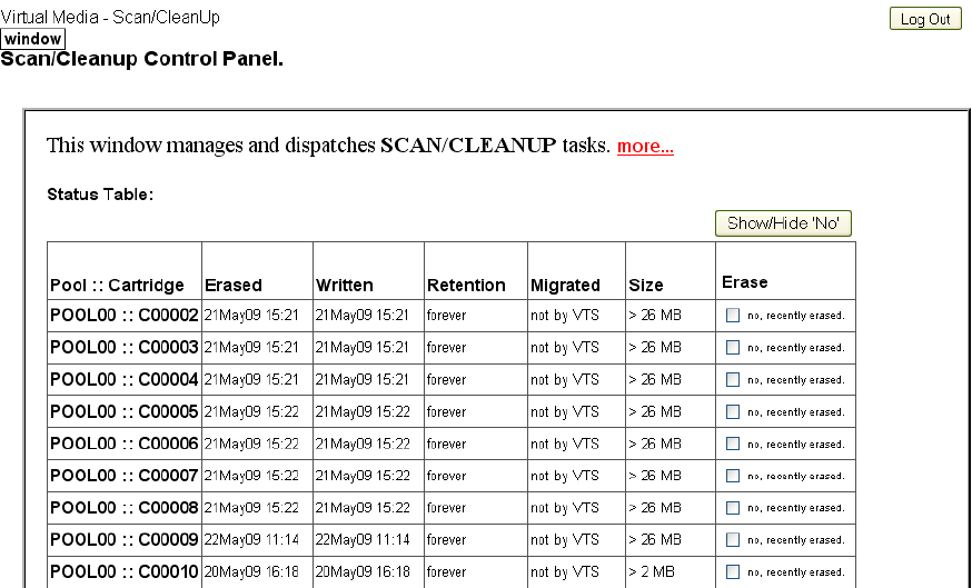 This table lists all virtual tapes on the system and their Scan/Cleanup status. The following is