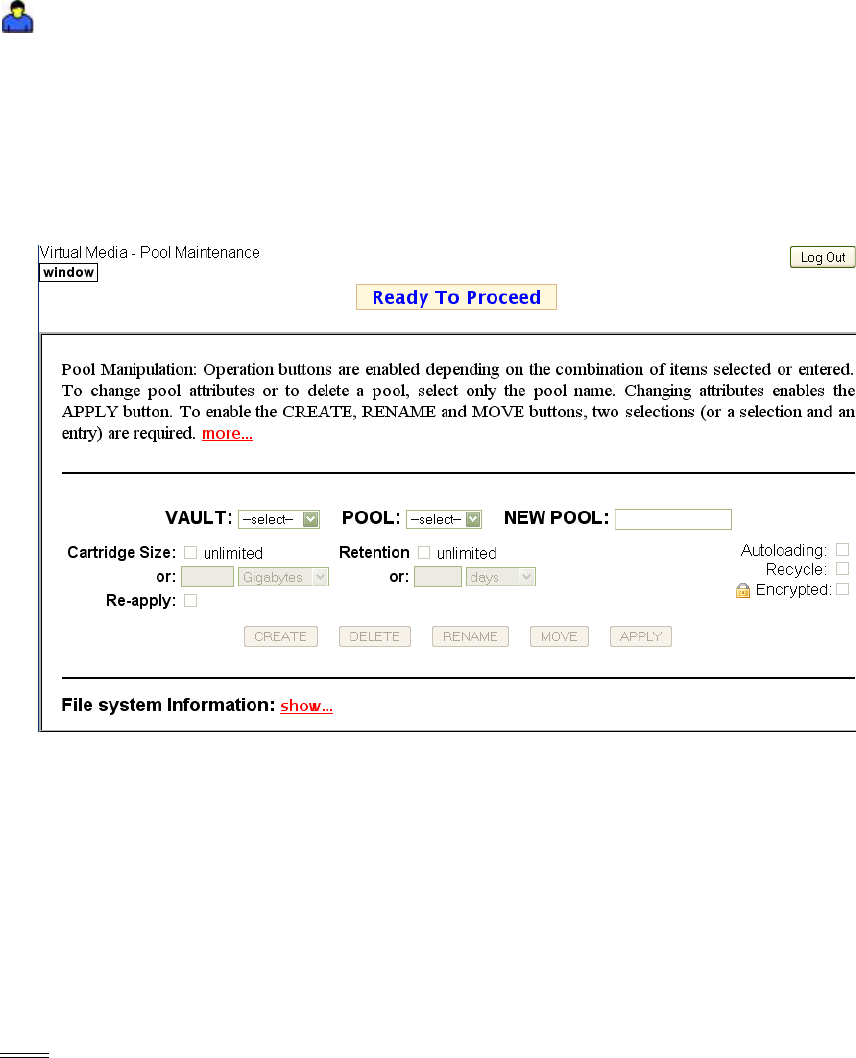 Tapes and Pools page. The Virtual Media - Pool Maintenance page is displayed.