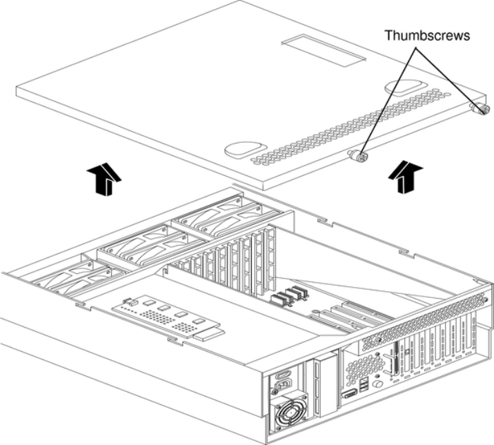 2. Loosen the two captive thumbscrews that hold the top cover in place.