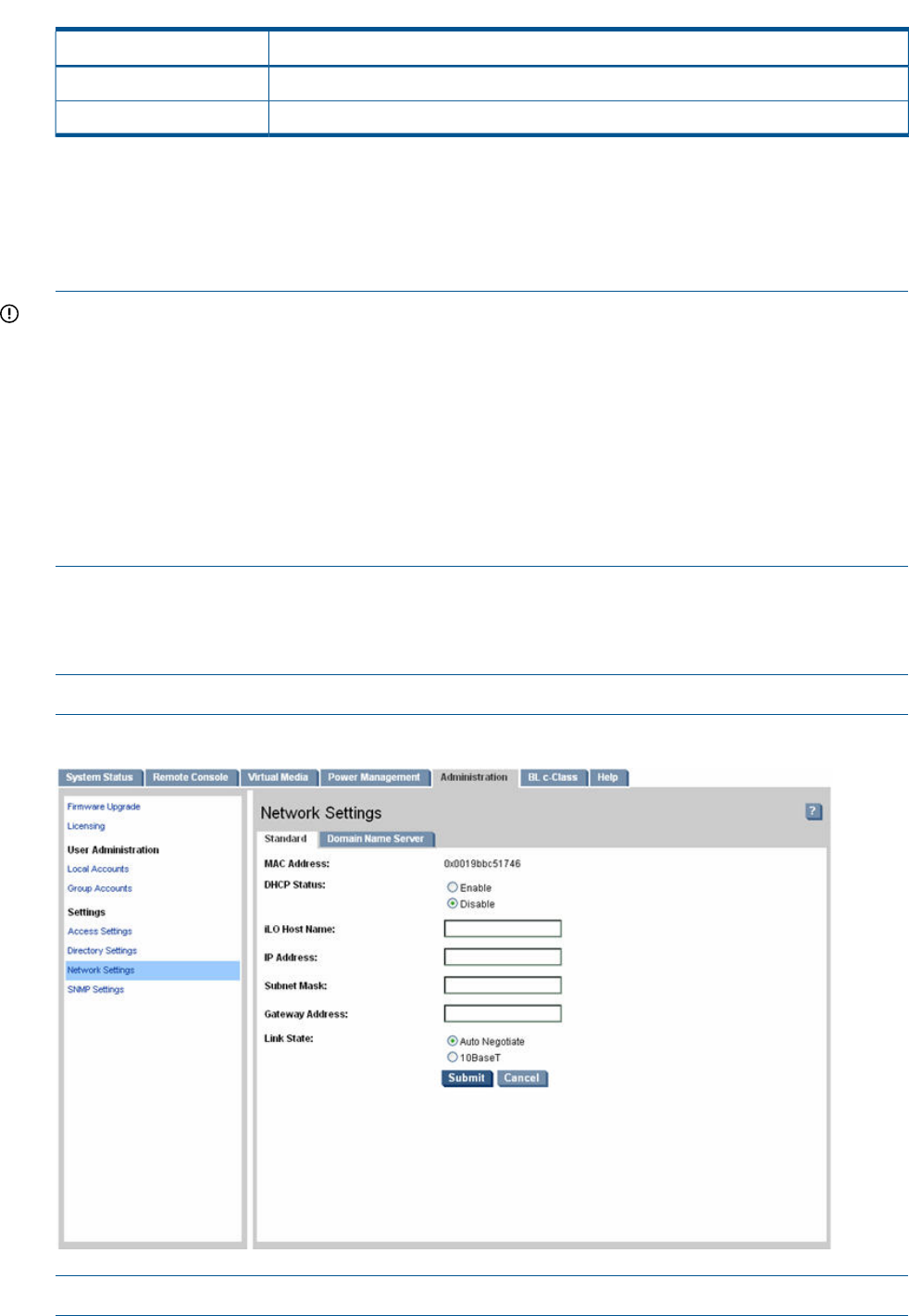address, subnet mask, or gateway IP address, iLO 2 alerts you to manually reset iLO 2. A warning