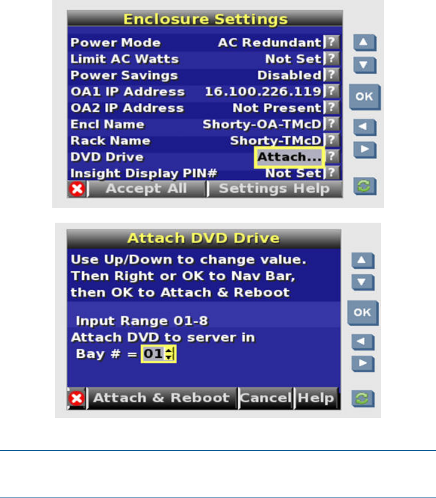 1. Using the LCD display on the OA enclosure, navigate to the DVD Drive - Attach...