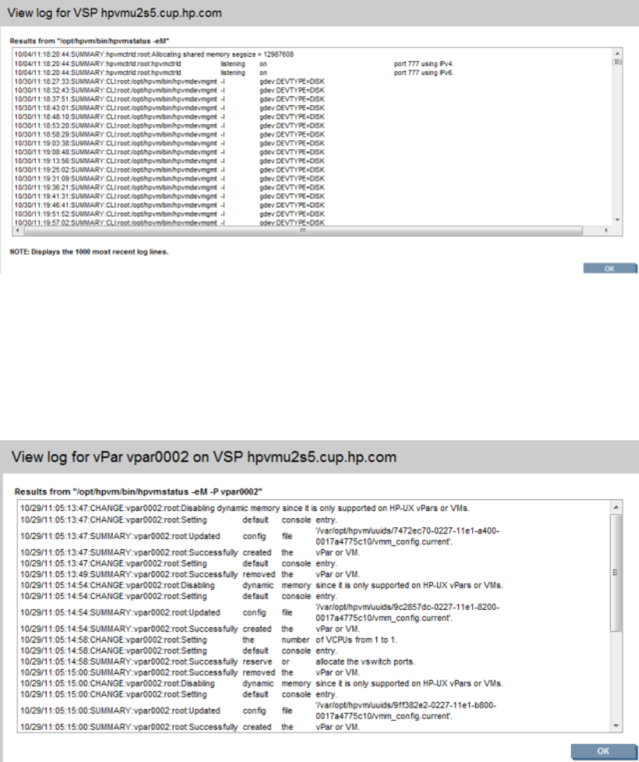 1. Select ViewVM or vPar Log in the Virtual Servers tab. The log for VM or vPar is displayed.
