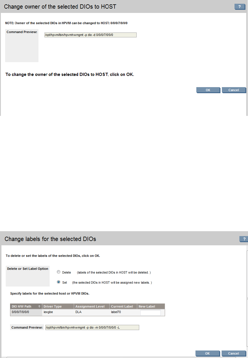 displays a note indicating that the owner of the selected DIOs will be changed from HPVM
