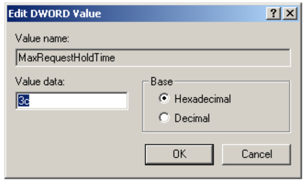 6 Double-click on the MaxRequestHoldTime registry value, highlighted