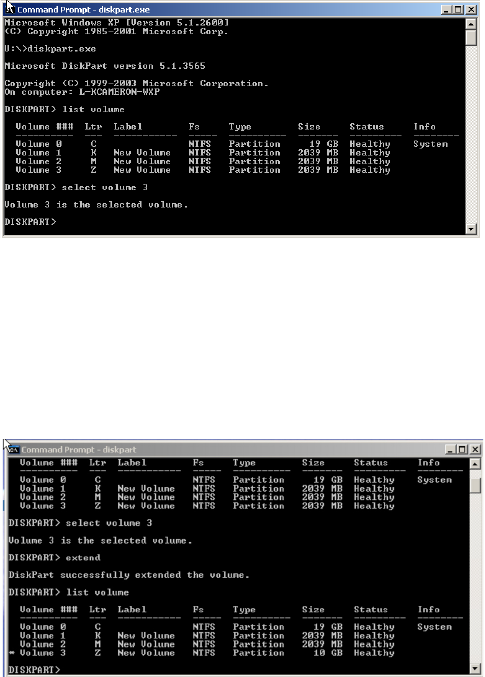4 Select the volume to extend by typing “select volume #” (where # is the