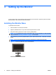 Table 4-1 Monitor Front Panel Controls (continued) Control Function 4 Menu Press to open the OSD window. 5 Power Turns the monitor on and off. LED status: ● Full Power Mode - Green or Blue ● Active-off Mode - Orange or Red Adjusting the Monitor Settings The monitor settings can be adjusted from the On-Screen Display (OSD) menu. To access the OSD and adjust screen settings base on your viewing preference, do the following: 1.