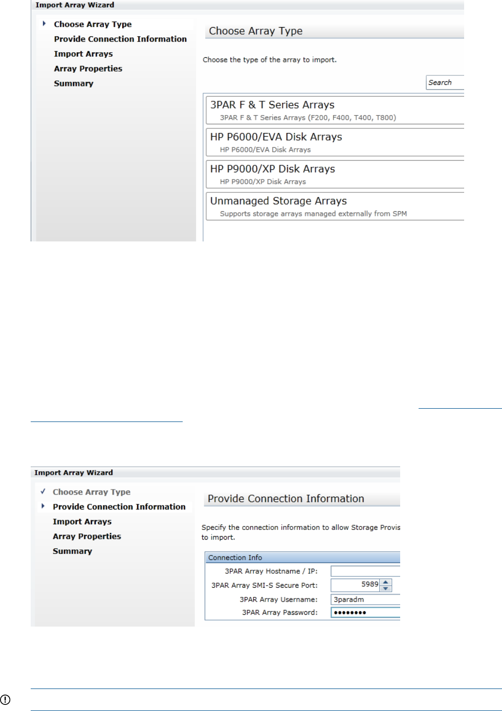 Specify the connection information for the arrays to import (for example, the 3PAR F & T Series