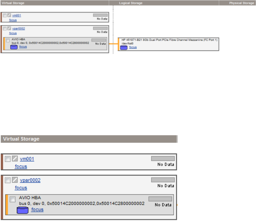• The Focus link limits the display to a specific VM or vPar or device and anything connected