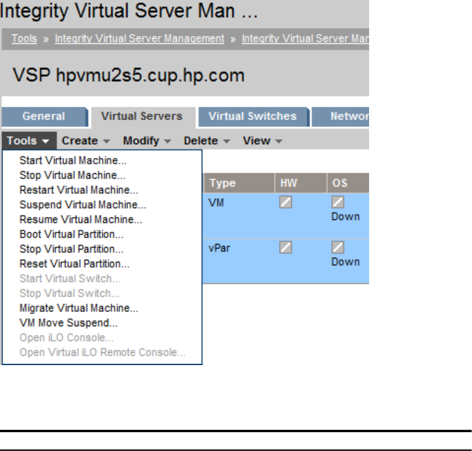 Figure 54 Integrity Virtual Server Manager Tools menu