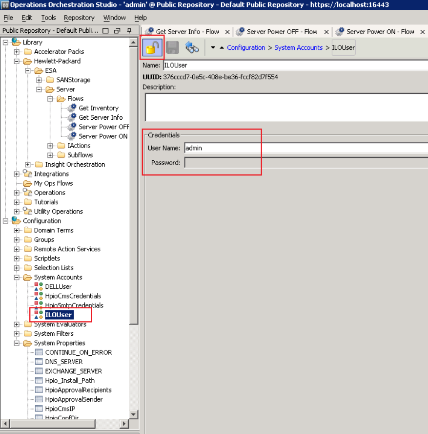 Within OO Studio, select the System Accounts folder and then select the appropriate account (in