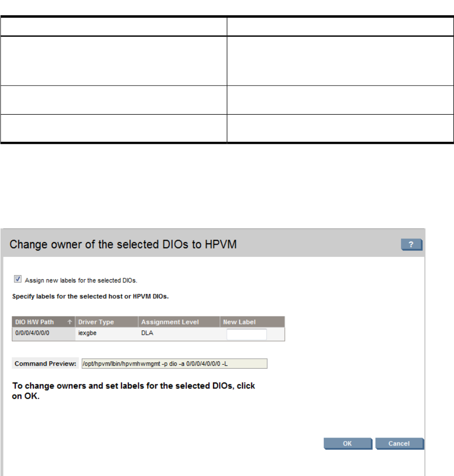 You can change the owner of a DIO from host to HPVM. If the DIO status is restricted, you cannot