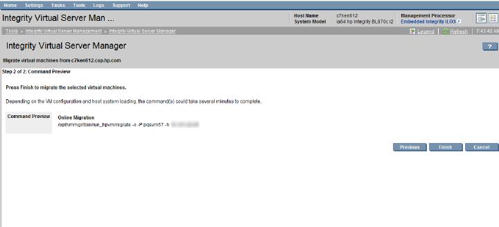 Integrity Virtual Server Manager returns you to the screen from which you initiated the Migrate