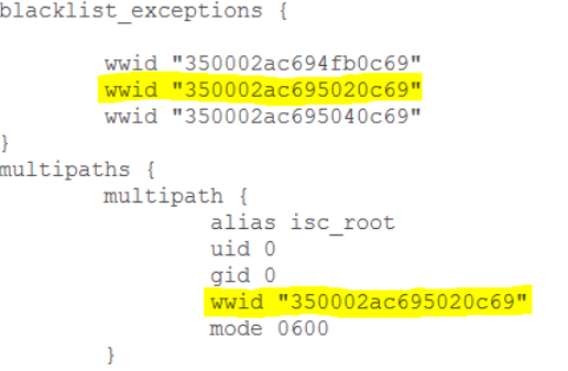 Edit the WWID as highlighted in the sample configuration below, for the alias “isc_root” to match the