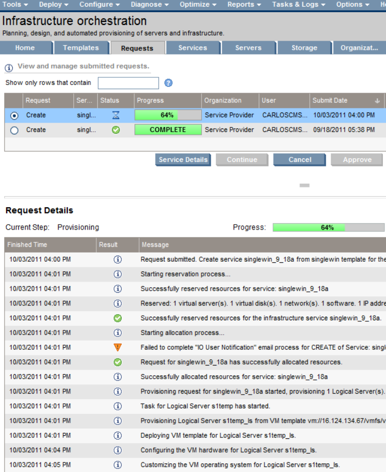 3. As provisioning proceeds, the requesting user can monitor progress of the deployment in the