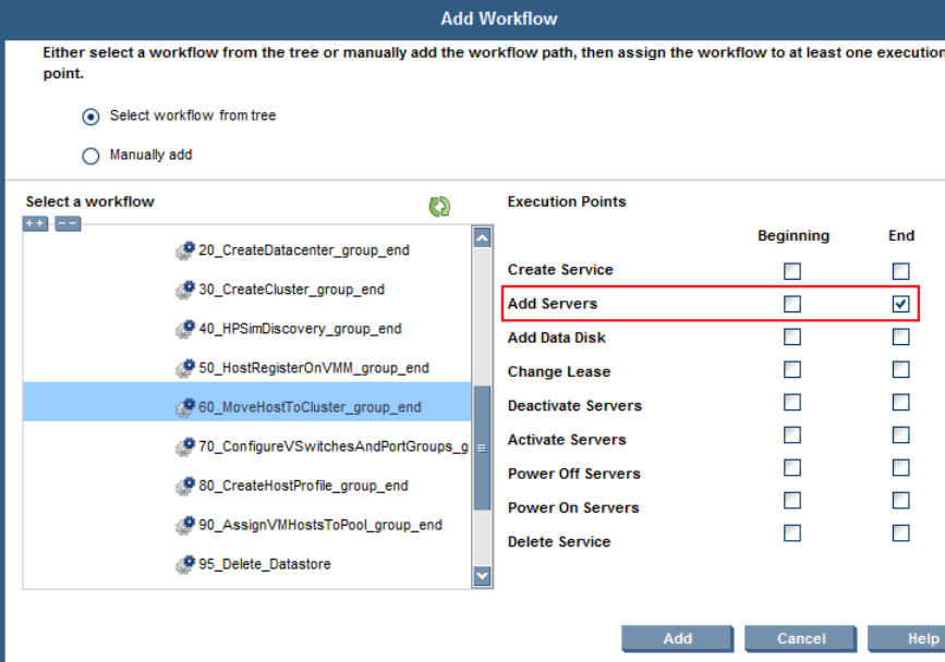 h. Select 90_AssignVMHostsToPool_group_end, click only the Add Servers End checkbox,