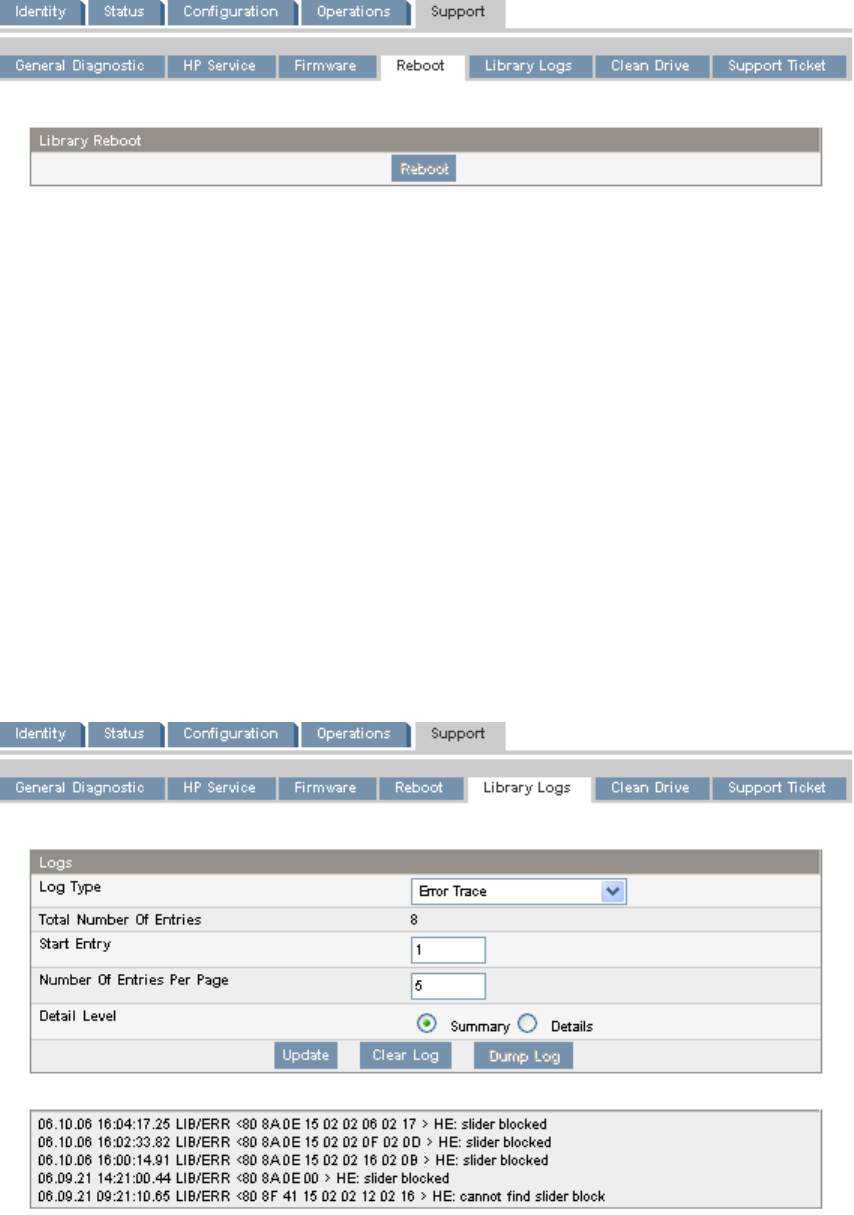 - Rebooting the tape library (Support > Reboot)