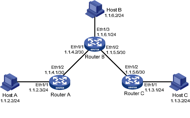 3. Configure the default gateways of Host A, Host B, and Host C as 1.1.2.3, 1.1.6.1, and 1.1.3.1.