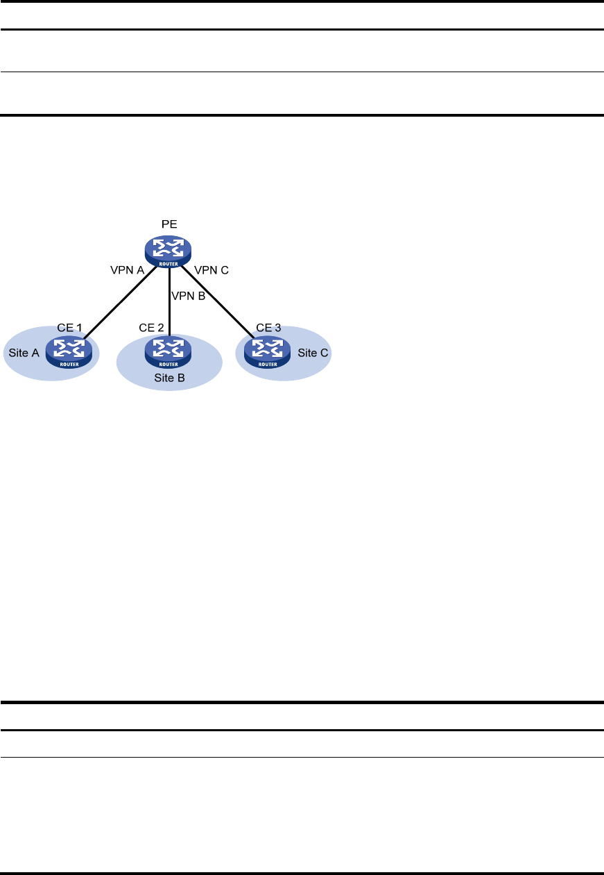As shown in Figure 60, in this scenario a PE connects to three sites that belong to different VPNs. Some